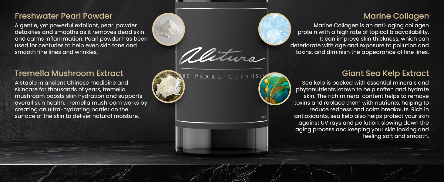 This is no ordinary face wash. It’s toxin-free and formulated to purify and heal. The Pearl Cleanser is rich in ancient, skin renewing ingredients, such as: Pearl Powder: gently exfoliates and evens skin tone Tremella Mushroom: blankets skin in long-lasting hydration Giant Sea Kelp: detoxifies and replenishes Marine Collagen: supports elasticity and smoothness Together, these ingredients create a symphony that cleanse, calm, and correct—leaving your skin luminous, not just clean.